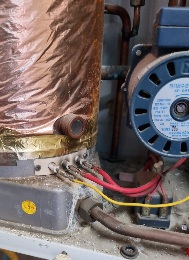 -먼저, 보일러 본체 하단에 있는 가스관(노란색)이 제대로 연결되어 있는지 확인합니다. 만약 가스관이 빠져 있거나 느슨하게 연결되어 있다면, 다시 단단하게 조여줍니다.