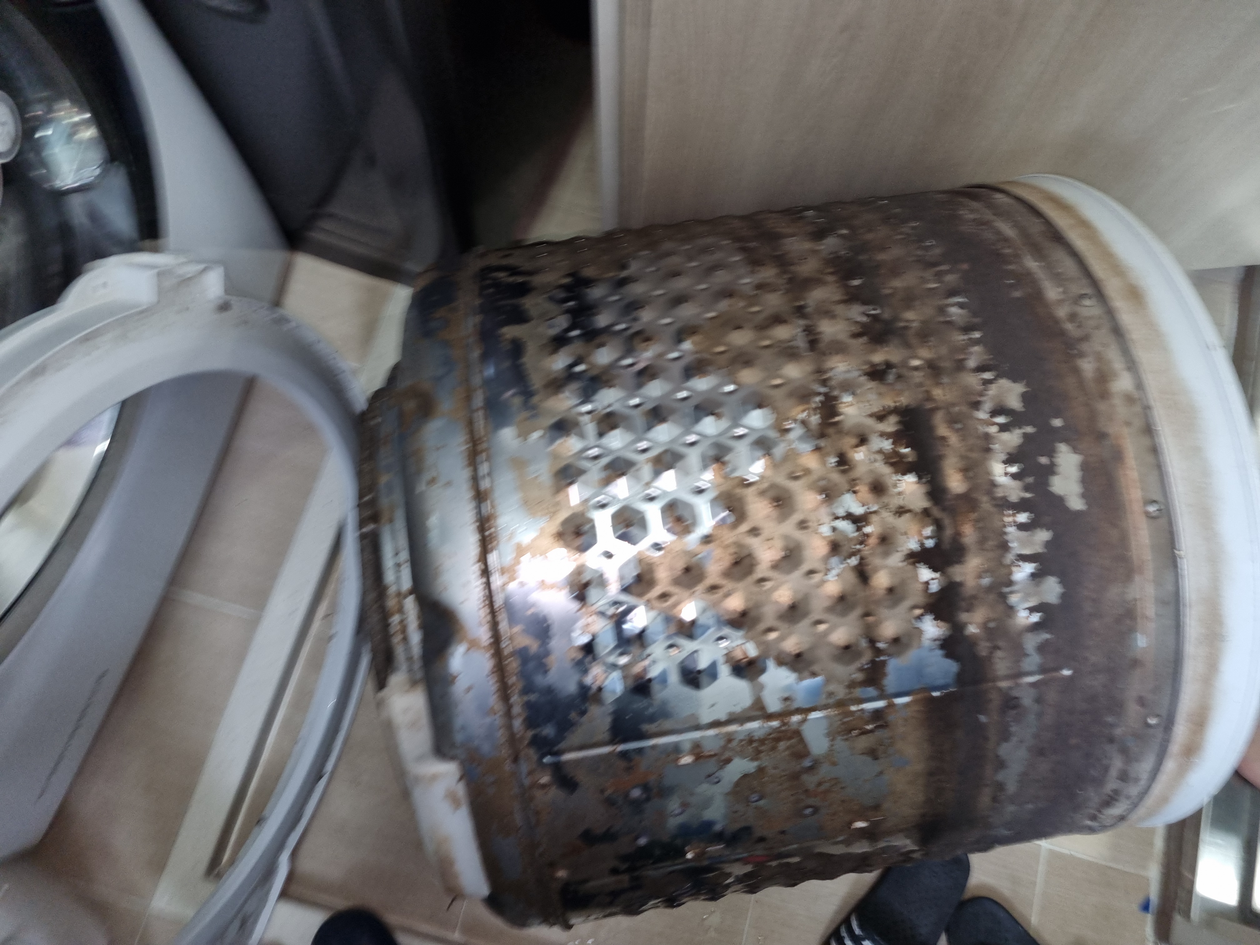 세탁조 안쪽은 찌든 때, 세제 찌꺼기, 곰팡이, 심지어 녹까지 가득한 상태죠. 특히 통 하부의 구조물은 오염물이 두껍게 눌어붙어 있고, 냄새의 원인이 되는 물때가 심하게 쌓여 있었습니다.